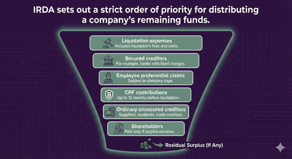 The IRDA sets out a strict order of priority for distributing a company’s remaining funds.